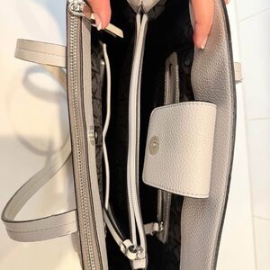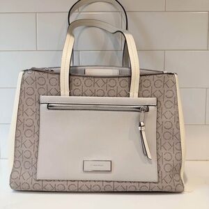 Stylish Calvin Klein tote with a beige and white design. Features a front pocket and elegant handles. Perfect for daily use.