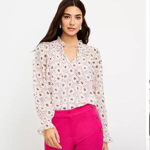 Loft Petite Pink Daisey Ruffle Tie Neck Long Sleeve Blouse