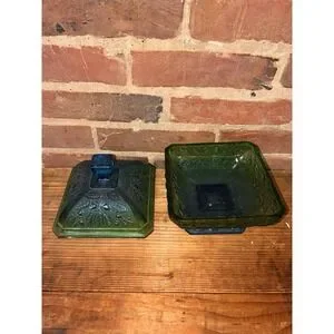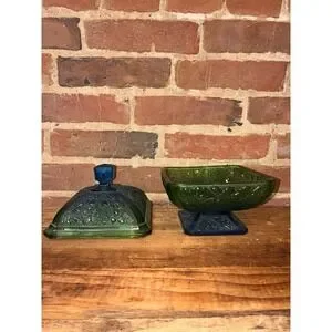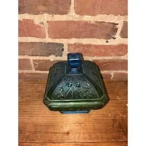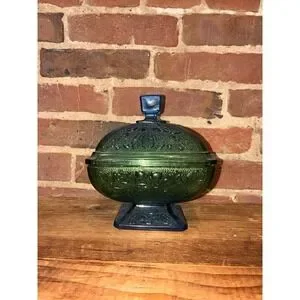 Presenting a classic Jeanette Glass 3525 footed covered candy dish, showcasing a charming blue and green color palette. This beautiful compote features a Victorian style design, meticulously crafted with raised grape and leaf patterns across its surface and lid. The rich blue and green hues gently blend, creating an appealing ombre effect that highlights the detailed pressed glass artistry. This piece serves as an elegant display for candies, trinkets, or simply as a decorative accent in any room. Its footed base provides stability and adds to its traditional aesthetic, making it a delightful addition to a collection or a standalone statement item. The covered design helps protect contents while maintaining its visual appeal. This pre-owned Jeanette Glass candy dish is a testament to enduring design and craftsmanship. The intricate grape and vine motif, combined with the distinctive blue-green coloring, evokes a sense of timeless charm and elegance.