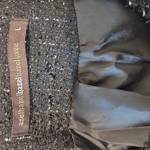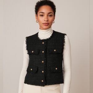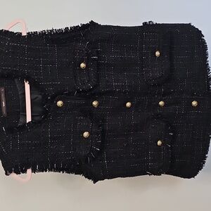 Anthropologie Hazel Black Boucle Tweed Fringe Gold Button Up Vest Pockets Sz L