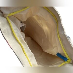 The fully lined cotton canvas bag is spacious and sturdy, making it perfect for trips to the beach or pool. Zip main closure and back of bag features a zip compartment. Pink and blue simulated leather carry straps.