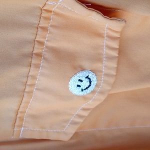 My FAVORITE shirt of all 100 from estate! All now listed. A Manhattan shirt, The Saturday Shirt. Kodel polyester blend. Soft orange. Funky band stitching on back, see pics.