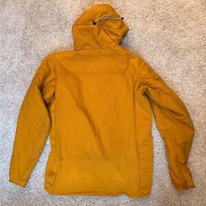 Men’s Arc'teryx Atom SV hooded jacket in vibrant golden yellow. Ideal for outdoor activities. Men’s Medium, slight wear on the ends of sleeves