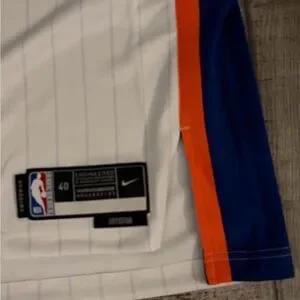 White jersey with bold blue and orange side stripes. Nike logo featured prominently. Jalen Brunson