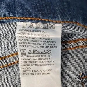 Medium wash, rip-and-repair distressing details.
