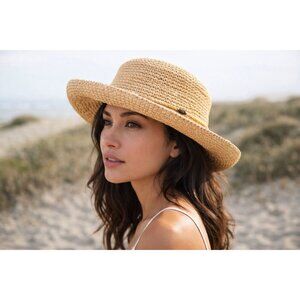 Classic and versatile Scala straw sun hat crafted from natural woven fiber. Structured crown with a gently curled wide brim that provides shade while maintaining shape. Finished with a subtle woven tie/bow detail at the back and a small Scala logo plaque at the side.