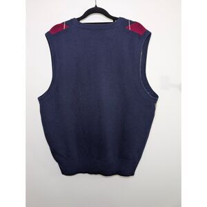 Classic Orvis 100% lambswool argyle sweater vest in a timeless navy, red, gray, and cream diamond pattern. Crafted from soft lambswool and made in Hong Kong, reflecting Orvis’s heritage quality construction. Features a traditional V-neck silhouette with ribbed hem and arm openings, perfect for layering over button-downs for a polished preppy look or embracing dadcore, golfcore, or dark academia styling.