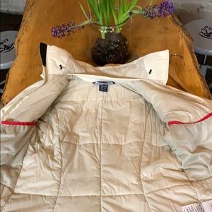Stylish Arc'teryx jacket. Cream color. Hooded design. Full zip closure.