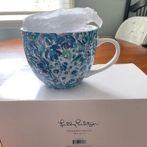 Enjoy your morning coffee or tea with this beautiful set of 2 ceramic mugs from Lilly Pulitzer. The blue and purple floral pattern, accented with gold, adds a touch of elegance to any kitchen. Signed Inside.
