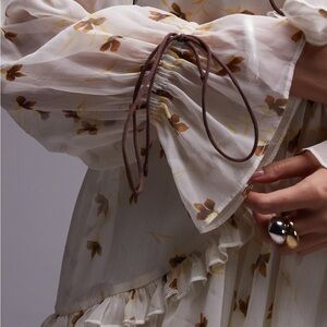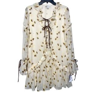 Topshop poet sleeve frill mini dress in butterfly floral. New with flaw- has tags attached but small stain on front of dress as shown in photo.