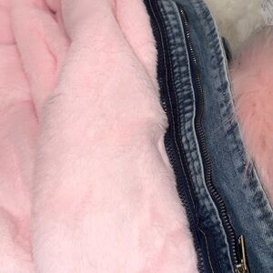 Stylish women's denim jacket featuring a soft pink fur trim. Perfect for adding a touch of elegance to your casual look.