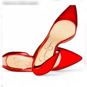 Elevate your look with these stunning Jessica Simpson Prizma pumps. Featuring a classic d'Orsay silhouette with sleek side cutouts and a sharp pointed toe, these vibrant red patent heels are a wardrobe essential for everything from office wear to special events.
