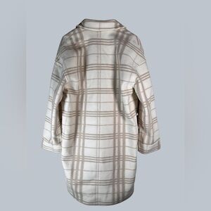 Design: A modern take on a classic cold-weather silhouette, this long coat features a timeless neutral plaid print.