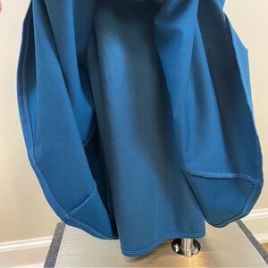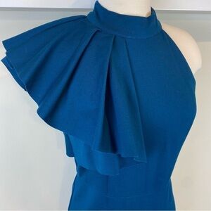 This full length gown in a medium weight stretch knit features a one shoulder with ruffle style. Hidden back zipper, princess seamed bodice and mermaid skirt with godet in back. Beautiful solid teal blue color. This form-fitting dress is striking.