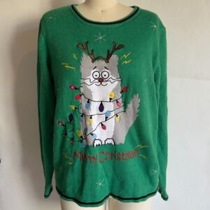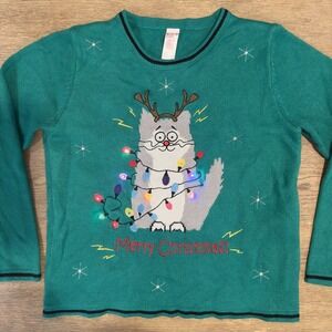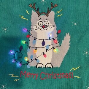 Holiday Time Cat Light Up Ugly Merry Christmas Party Sweater-Size L-Green-Works
