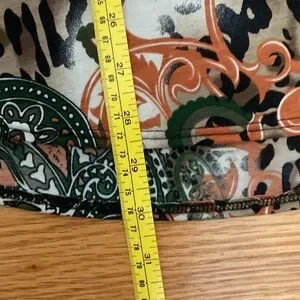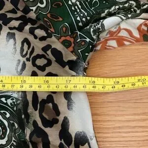 Stylish women's top featuring a bold leopard print with green and orange paisley accents. Perfect for adding a touch of wild elegance to your wardrobe.