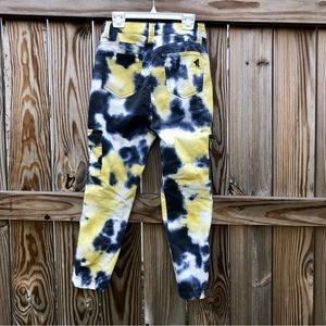 VIP Jeans cargo in tie dye digital Camo yellow and blue. Silver button zip closure with cargo pockets on each side. Tapered at bottom in size 7/28. Rise-11 1/2 inches, inseam 23 1/2 inches, length-34 1/4 inches Excellent condition.