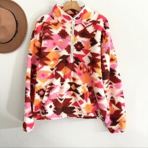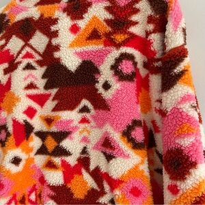Stay cozy and stylish with this vibrant geometric pattern sweater. Featuring a mix of pink, orange, and brown hues, it's perfect for adding a pop of color to your wardrobe.