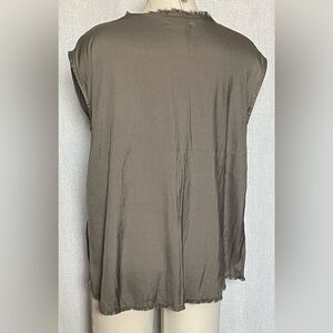 Silky satiny soft. Taupe color. Neckline and hemline are fringed, adds a cute textural detail. Sleeveless. Great alone in summer with shirts or in fall winter with jacket or cardigan. Made in 🇺🇸