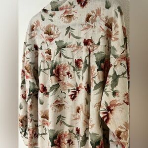 Chic button-down shirt with floral design. Soft cream base with pink and green accents. Ideal for casual elegance.