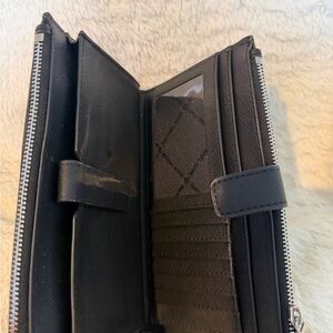 Stylish black Saffiano leather double zip wristlet/wallet with chrome hardware. Detachable wristlet strap. Large enough to hold Smartphone. Snap closure for security. Never Used! Brand New! Card slots and ID window.