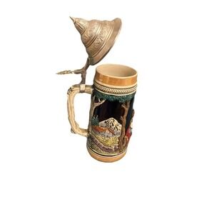 Keywords: German beer stein, vintage collectible, hand painted, pewter lid, alpine scene, Oktoberfest decor, barware collectible, traditional stein, ceramic beer mug, unique gift, home bar accessory, European souvenir