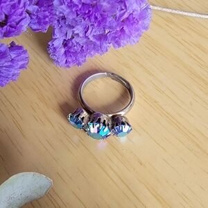This vintage aurora borealis 3 prong ring is adorned with iridescent blue stones, adding a stylish flair to your look. size 5 1/2.