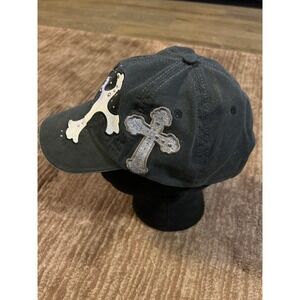 Stylish baseball cap featuring cross embellishments and rhinestone accents. This eye-catching hat adds a touch of edgy flair to any casual outfit. The design includes two prominent crosses, one outlined and the other filled with sparkling rhinestones, set against a dark background. The adjustable strap ensures a comfortable fit for various head sizes. Perfect for adding a unique touch to your everyday style, concerts, or casual outings.