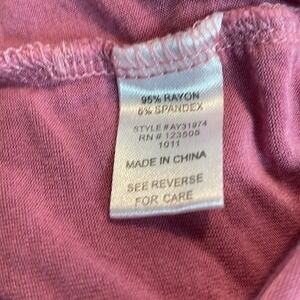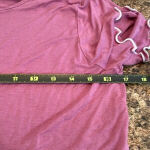 Keywords: women's top, short sleeve shirt, crew neck top, casual tee, ruffle trim, mauve shirt, ladies top, everyday top, cute shirt, summer top