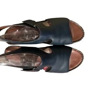 Stylish dark blue leather sandals. Ideal for casual wear. Comfortable and chic.