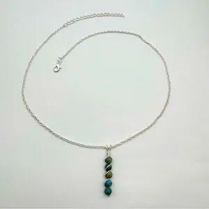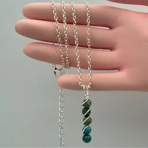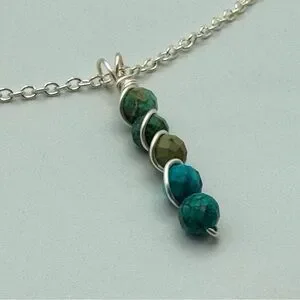 Elegant and understated, this delicate gemstone necklace features a vertical drop pendant composed of faceted beads in rich teal, moss green, and earthy neutral tones. Each stone is individually wire-wrapped, creating a graceful spiral design that adds texture and artisan character.
