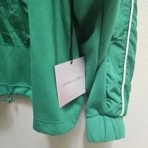 New, with tags, Happily Grey 1/4 Zip Pullover Track Top with long sleeves, kangaroo snap pocket, drawstring, and white stripe down arms. Buttery soft fabric and very comfortable!