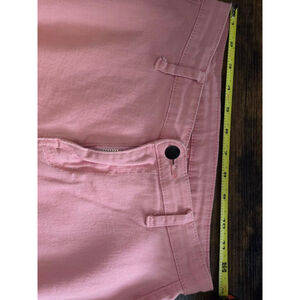 These pre-owned pink jeans, size M, feature a classic five-pocket design and a zip-fly with a button closure. The material appears to be cotton or a cotton blend. The jeans have a noticeable flared leg opening. There are no visible stains or tears, but the fabric shows slight fading, consistent with wear. The hem of the pants is frayed.
