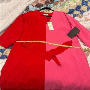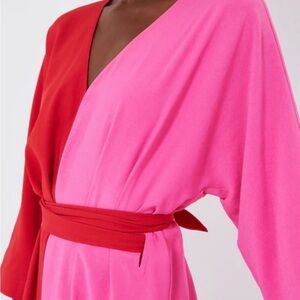 Elegant maxi dress with a bold color block design. Features vibrant red and pink hues. Perfect for any occasion.