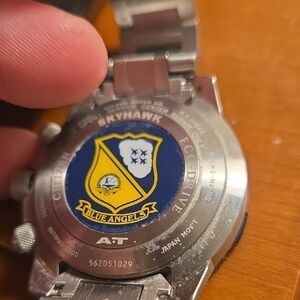 Stylish Citizen watch with a navy dial and silver bracelet. Features chronograph subdials and digital display.