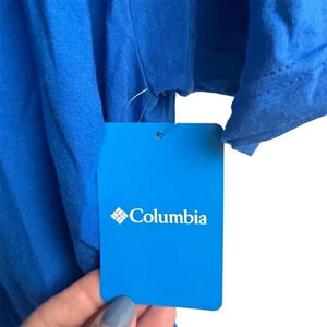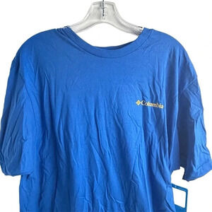 This Columbia Sportswear Company men's T-shirt in size L features a blue graphic print with a logo accent. Made from 100% cotton, it offers a regular fit with a crew neckline and short sleeves, suitable for outdoor and casual occasions. The T-shirt is machine washable and designed for all seasons. It is new with tags.