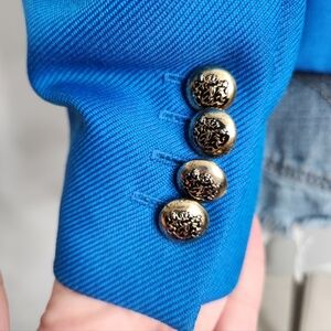 EUC ** Please note the fabric/care tags have been removed, and very small run at one cuff ** Decidedly tailored, this single-breasted blazer ends at the high hip. It is fabricated in a striking blue twill and features signature oversized brass buttons. * Color: Zephyr * 52% Polyester, 48% Wool. Dry Clean Only. * Smythe blazers tend to run small. * Model is 5 ' 11", weighs 120 lbs and is wearing a size 2. * Made in Canada 🌟New to Poshmark? Sign up now with my code OH_THRIFTY_LADY to save $15 on your first order🌟 MANNEQUIN MEASUREMENTS: B: 33.5" W: 25" H: 33" βœ” Non-smoking 🚭 βœ” Please review πŸ”Ž items carefully βœ” Ask any Q's you may have! πŸ€” βœ”οΈ See pics for approximate measurements πŸ“ βœ”οΈ Ship ASAP! πŸ’Œ BUNDLE ITEMS & SAVE! πŸ’Œ