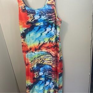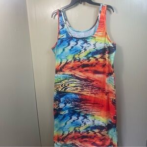 Eye-catching tank dress featuring a vibrant and colorful abstract print. This sleeveless dress is designed for comfort and style, making it a perfect choice for warm weather. Its relaxed fit and breathable fabric ensure all-day comfort, whether you're lounging at home or out and about. The dress has a scoop neckline and a straight silhouette that falls to about knee length. Ideal for casual outings, beach days, or as a stylish cover-up by the pool. Pair it with sandals or sneakers for a relaxed look, or dress it up with accessories for a more polished ensemble.