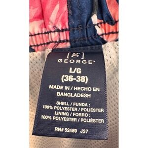 Keywords: mens swim trunks, flamingo print, swim shorts, beach wear, poolside fashion, elastic waist, drawstring closure, summer clothing, vacation attire, tropical print, mens shorts, size large, George, swimwear