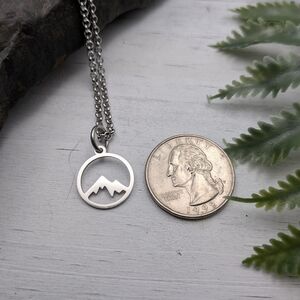 Elegant silver necklace featuring a mountain pendant. Perfect for adding a touch of nature-inspired style to any outfit.