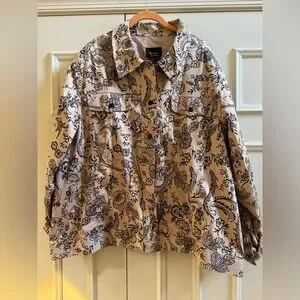 Stylish jean jacket with intricate black floral design. Perfect for casual outings.