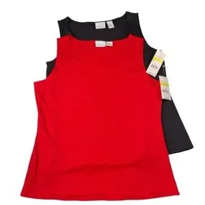 Kim Rogers sleeveless jewel neck tank tops come in a convenient two-pack featuring one solid red and one classic black top. These versatile basics offer a smooth, stretchy fit perfect for layering or wearing solo. The jewel neckline provides a polished look suitable for office wear or casual outings. Made with a comfortable nylon blend, these essential shells transition easily between seasons.