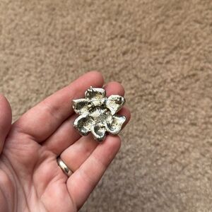 Dazzling silver flower brooch featuring a pearl center. Ideal for adding elegance to any ensemble. Good used condition. All sparkly stones are in place. Pearl has some signs of wear - hardly noticeable. Selling as is.