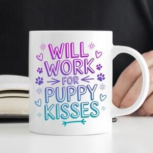 Start your day with a wagging tail and a warm beverage in this delightful 'Will Work for Puppy Kisses' coffee mug! This charming 15 oz white mug is an absolute must-have for every dog lover and anyone who appreciates a good laugh with their morning routine. It's the perfect way to add a touch of joy and personality to your kitchen or office.