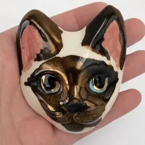 KM Hawaii, Karen Mark Kelleher, Maui studio pottery, ceramic cat brooch, vintage cat jewelry, figural animal brooch, 1980s cat pin, collectible studio pottery jewelry, Siamese cat