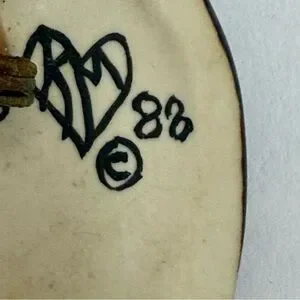 Vintage signed KM Hawaii ceramic cat brooch dated 1988. This hand-painted figural cat pin was created in Maui, Hawaii by artists Karen & Mark Kelleher and represents their collectible studio pottery jewelry work.