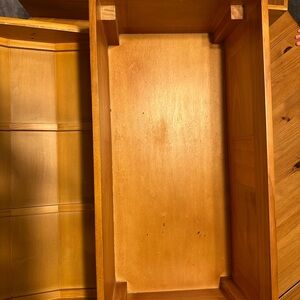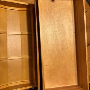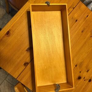 This is the version with the lift out tray. Good condition overall. Please check photo of top lid corner—there is a chip. The interior handles have shed a layer of peeling plastic leather but are still functional. Felt feet added to the bottom for use on a wood floor, but can be easily removed.