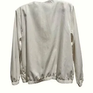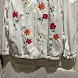 Delightfully feminine Alfred Dunner Floral Pink White Zip Up Jacket in size 12. Lightweight and practical, it features a charming floral pattern that adds a touch of elegance to any outfit.