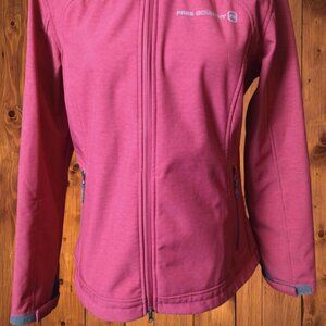 Free Country women's Small red jacket has faux fur lining that is made of 100% polyester. The outer shell is made of 93% polyester and 7% spandex and is soft shell. It has zippered pockets with hook and loop adjustable closure on the sleeves. The hood is removeable. Underarm to underarm measurement laying flat is 19 inches and shoulder seam to bottom hem is 22 inches.