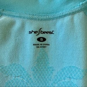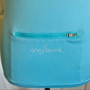 SheBeest blue cycling jersey, size small. Features 3/4 zip front, and a back zippered pocket.